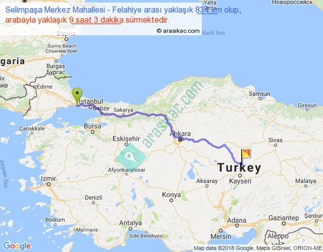 Selimpaşa Merkez Mahallesi - Felahiye arası yaklaşık olarak 90 km/h ile yukarıda belirtilen sürede olup, iki yerin kuş uçuşu uzaklığı (mesafesi) 645'dir. Eğer belirtilen yerler arasında uçak seferi var ise bu süre uçakla 59 dakika'ya kadar düşebilir. Yolculuk otobüsle 11 saat 45 dakika sürmektedir.