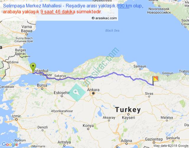 Selimpaşa Merkez Mahallesi - Reşadiye arası yaklaşık olarak 90 km/h ile yukarıda belirtilen sürede olup, iki yerin kuş uçuşu uzaklığı (mesafesi) 753'dir. Eğer belirtilen yerler arasında uçak seferi var ise bu süre uçakla 1 saat 09 dakika'ya kadar düşebilir. Yolculuk otobüsle 12 saat 41 dakika sürmektedir.