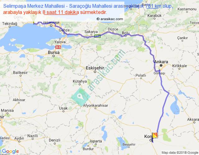 Selimpaşa Merkez Mahallesi - Saraçoğlu Mahallesi arası yaklaşık olarak 90 km/h ile yukarıda belirtilen sürede olup, iki yerin kuş uçuşu uzaklığı (mesafesi) 507'dir. Eğer belirtilen yerler arasında uçak seferi var ise bu süre uçakla 46 dakika'ya kadar düşebilir. Yolculuk otobüsle 10 saat 38 dakika sürmektedir.