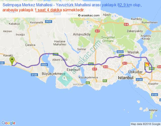 Selimpaşa Merkez Mahallesi - Yavuztürk Mahallesi arası yaklaşık olarak 90 km/h ile yukarıda belirtilen sürede olup, iki yerin kuş uçuşu uzaklığı (mesafesi) 61'dir. Yolculuk otobüsle 1 saat 23 dakika sürmektedir.