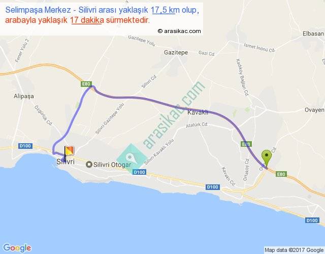 Selimpaşa Merkez - Silivri arası yaklaşık olarak 90 km/h ile yukarıda belirtilen sürede olup, iki yerin kuş uçuşu uzaklığı (mesafesi) 11'dir. Yolculuk otobüsle 22 dakika sürmektedir.