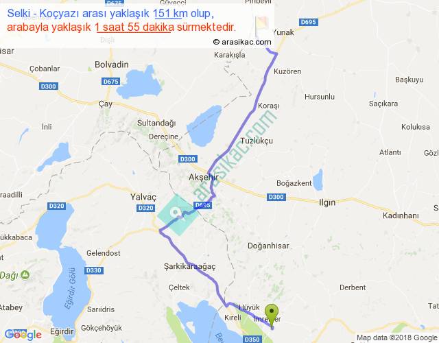 Selki - Koçyazı arası yaklaşık olarak 90 km/h ile yukarıda belirtilen sürede olup, iki yerin kuş uçuşu uzaklığı (mesafesi) 101'dir. Yolculuk otobüsle 2 saat 29 dakika sürmektedir.