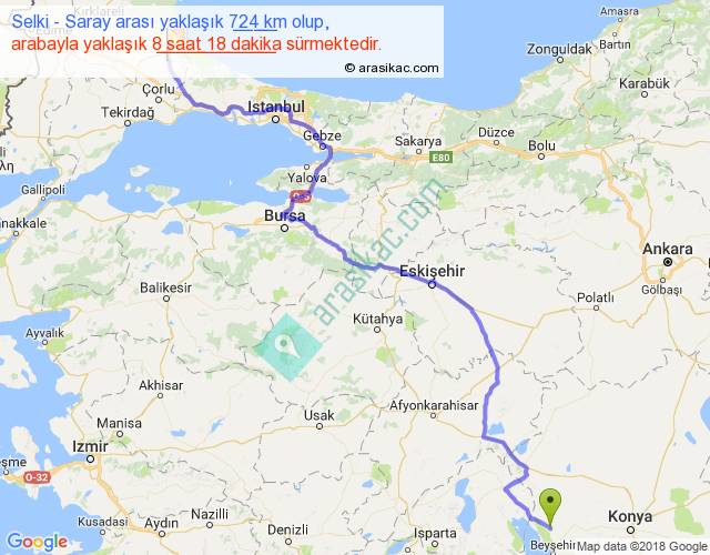 Selki - Saray arası yaklaşık olarak 90 km/h ile yukarıda belirtilen sürede olup, iki yerin kuş uçuşu uzaklığı (mesafesi) 507'dir. Eğer belirtilen yerler arasında uçak seferi var ise bu süre uçakla 46 dakika'ya kadar düşebilir. Yolculuk otobüsle 10 saat 47 dakika sürmektedir.