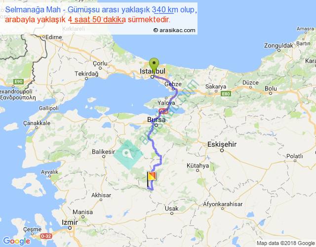Selmanağa Mah - Gümüşsu arası yaklaşık olarak 90 km/h ile yukarıda belirtilen sürede olup, iki yerin kuş uçuşu uzaklığı (mesafesi) 209'dir. Yolculuk otobüsle 6 saat 17 dakika sürmektedir.