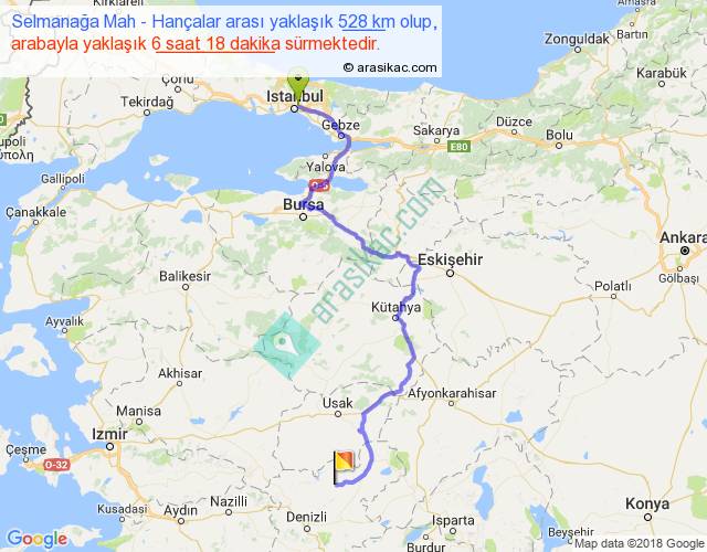 Selmanağa Mah - Hançalar arası yaklaşık olarak 90 km/h ile yukarıda belirtilen sürede olup, iki yerin kuş uçuşu uzaklığı (mesafesi) 322'dir. Eğer belirtilen yerler arasında uçak seferi var ise bu süre uçakla 29 dakika'ya kadar düşebilir. Yolculuk otobüsle 8 saat 11 dakika sürmektedir.
