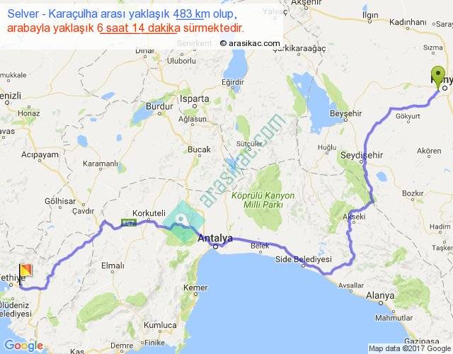 Selver - Karaçulha arası yaklaşık olarak 90 km/h ile yukarıda belirtilen sürede olup, iki yerin kuş uçuşu uzaklığı (mesafesi) 314'dir. Eğer belirtilen yerler arasında uçak seferi var ise bu süre uçakla 28 dakika'ya kadar düşebilir. Yolculuk otobüsle 8 saat 6 dakika sürmektedir.