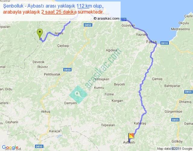 Şenbolluk - Aybastı arası yaklaşık olarak 90 km/h ile yukarıda belirtilen sürede olup, iki yerin kuş uçuşu uzaklığı (mesafesi) 52'dir. Yolculuk otobüsle 3 saat 8 dakika sürmektedir.