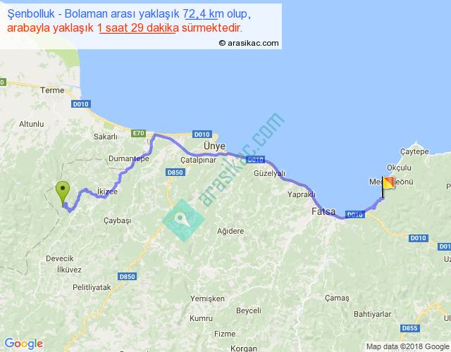 Şenbolluk - Bolaman arası yaklaşık olarak 90 km/h ile yukarıda belirtilen sürede olup, iki yerin kuş uçuşu uzaklığı (mesafesi) 52'dir. Yolculuk otobüsle 1 saat 55 dakika sürmektedir.