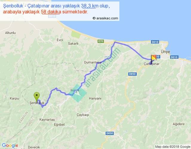 Şenbolluk - Çatalpınar arası yaklaşık olarak 90 km/h ile yukarıda belirtilen sürede olup, iki yerin kuş uçuşu uzaklığı (mesafesi) 23'dir. Yolculuk otobüsle 1 saat 15 dakika sürmektedir.