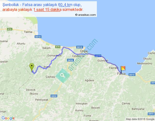 Şenbolluk - Fatsa arası yaklaşık olarak 90 km/h ile yukarıda belirtilen sürede olup, iki yerin kuş uçuşu uzaklığı (mesafesi) 42'dir. Yolculuk otobüsle 1 saat 37 dakika sürmektedir.