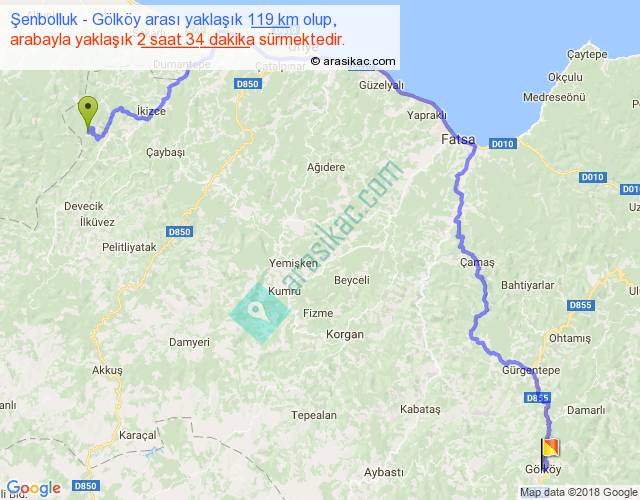 Şenbolluk - Gölköy arası yaklaşık olarak 90 km/h ile yukarıda belirtilen sürede olup, iki yerin kuş uçuşu uzaklığı (mesafesi) 65'dir. Yolculuk otobüsle 3 saat 20 dakika sürmektedir.