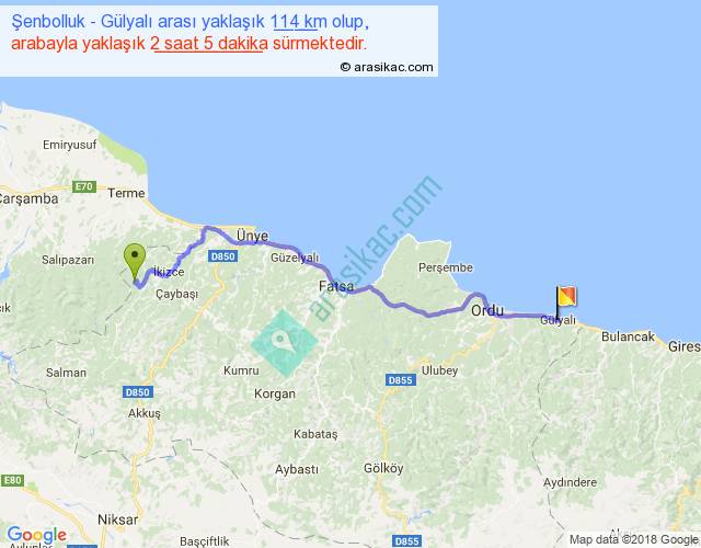 Şenbolluk - Gülyalı arası yaklaşık olarak 90 km/h ile yukarıda belirtilen sürede olup, iki yerin kuş uçuşu uzaklığı (mesafesi) 89'dir. Yolculuk otobüsle 2 saat 42 dakika sürmektedir.