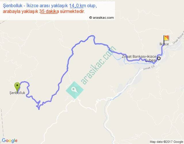 Şenbolluk - İkizce arası yaklaşık olarak 90 km/h ile yukarıda belirtilen sürede olup, iki yerin kuş uçuşu uzaklığı (mesafesi) 8'dir. Yolculuk otobüsle 45 dakika sürmektedir.