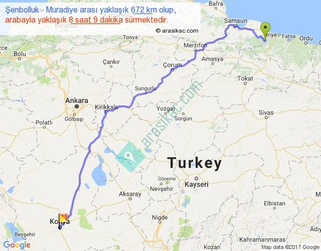 Şenbolluk - Muradiye arası yaklaşık olarak 90 km/h ile yukarıda belirtilen sürede olup, iki yerin kuş uçuşu uzaklığı (mesafesi) 521'dir. Eğer belirtilen yerler arasında uçak seferi var ise bu süre uçakla 48 dakika'ya kadar düşebilir. Yolculuk otobüsle 10 saat 35 dakika sürmektedir.