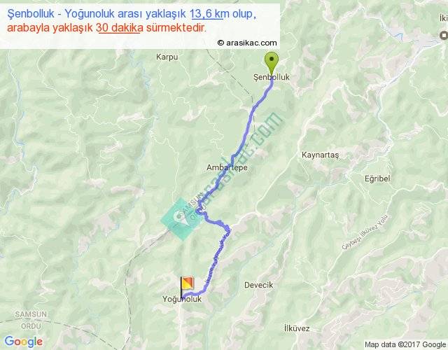 Şenbolluk - Yoğunoluk arası yaklaşık olarak 90 km/h ile yukarıda belirtilen sürede olup, iki yerin kuş uçuşu uzaklığı (mesafesi) 10'dir. Yolculuk otobüsle 39 dakika sürmektedir.