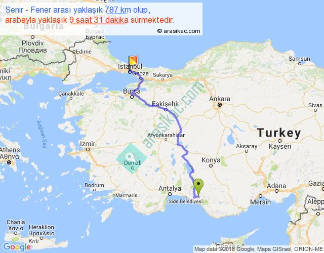 Senir - Fener arası yaklaşık olarak 90 km/h ile yukarıda belirtilen sürede olup, iki yerin kuş uçuşu uzaklığı (mesafesi) 534'dir. Eğer belirtilen yerler arasında uçak seferi var ise bu süre uçakla 49 dakika'ya kadar düşebilir. Yolculuk otobüsle 12 saat 22 dakika sürmektedir.