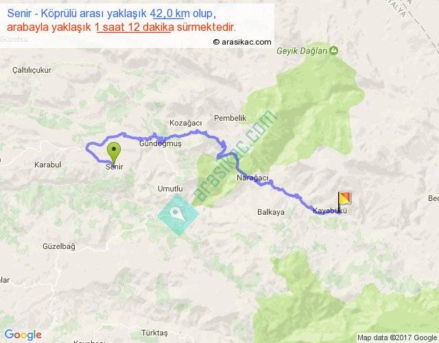 Senir - Köprülü arası yaklaşık olarak 90 km/h ile yukarıda belirtilen sürede olup, iki yerin kuş uçuşu uzaklığı (mesafesi) 20'dir. Yolculuk otobüsle 1 saat 33 dakika sürmektedir.
