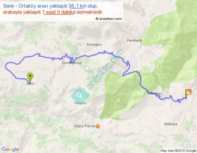 Senir - Ortaköy arası yaklaşık olarak 90 km/h ile yukarıda belirtilen sürede olup, iki yerin kuş uçuşu uzaklığı (mesafesi) 15'dir. Yolculuk otobüsle 1 saat 18 dakika sürmektedir.