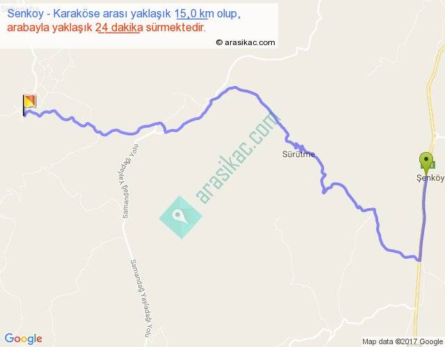 Senkoy - Karaköse arası yaklaşık olarak 90 km/h ile yukarıda belirtilen sürede olup, iki yerin kuş uçuşu uzaklığı (mesafesi) 9'dir. Yolculuk otobüsle 31 dakika sürmektedir.
