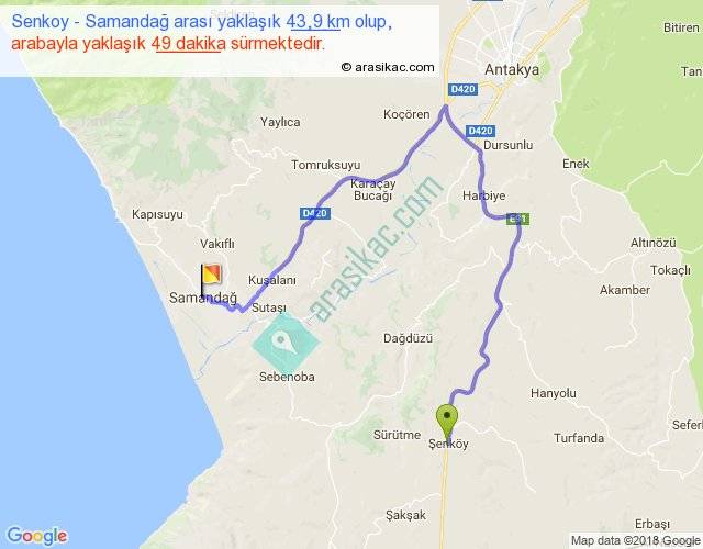 Senkoy - Samandağ arası yaklaşık olarak 90 km/h ile yukarıda belirtilen sürede olup, iki yerin kuş uçuşu uzaklığı (mesafesi) 16'dir. Yolculuk otobüsle 1 saat 3 dakika sürmektedir.