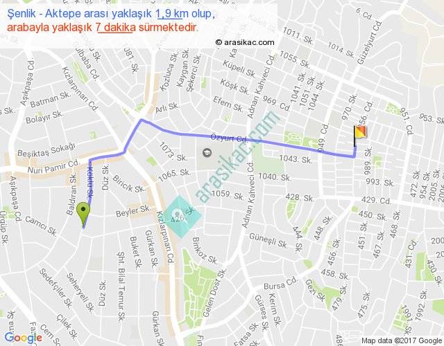 Şenlik - Aktepe arası yaklaşık olarak 90 km/h ile yukarıda belirtilen sürede olup, iki yerin kuş uçuşu uzaklığı (mesafesi) 1'dir. Yolculuk otobüsle 9 dakika sürmektedir.