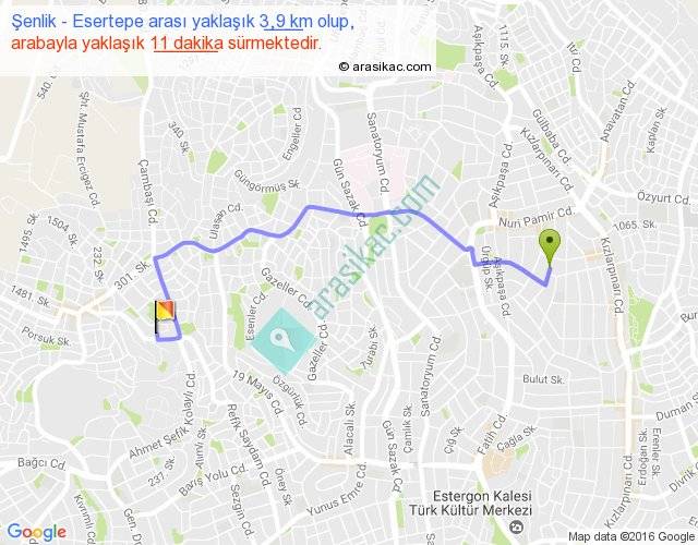 Şenlik - Esertepe arası yaklaşık olarak 90 km/h ile yukarıda belirtilen sürede olup, iki yerin kuş uçuşu uzaklığı (mesafesi) 3'dir. Yolculuk otobüsle 14 dakika sürmektedir.