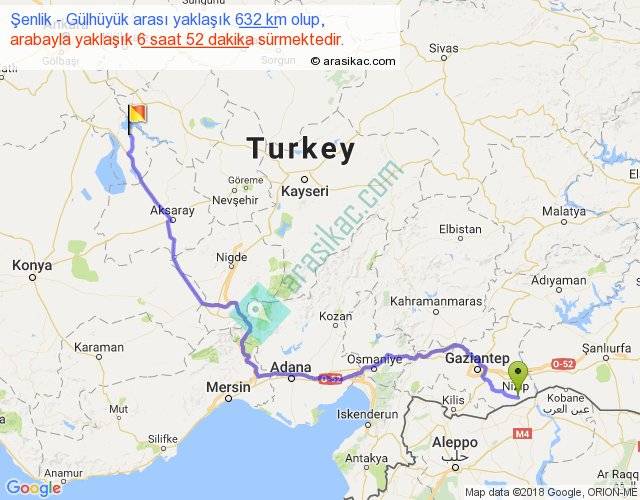 Şenlik - Gülhüyük arası yaklaşık olarak 90 km/h ile yukarıda belirtilen sürede olup, iki yerin kuş uçuşu uzaklığı (mesafesi) 448'dir. Eğer belirtilen yerler arasında uçak seferi var ise bu süre uçakla 41 dakika'ya kadar düşebilir. Yolculuk otobüsle 8 saat 55 dakika sürmektedir.