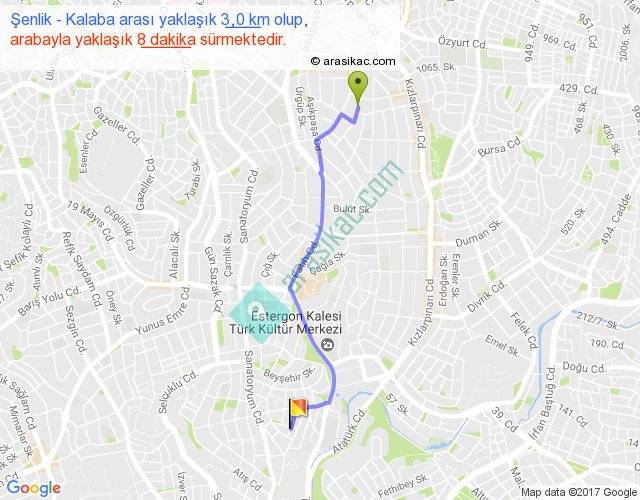 Şenlik - Kalaba arası yaklaşık olarak 90 km/h ile yukarıda belirtilen sürede olup, iki yerin kuş uçuşu uzaklığı (mesafesi) 2'dir. Yolculuk otobüsle 10 dakika sürmektedir.
