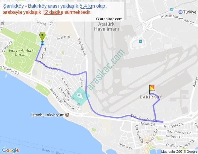 Şenlikköy - Bakirköy arası yaklaşık olarak 90 km/h ile yukarıda belirtilen sürede olup, iki yerin kuş uçuşu uzaklığı (mesafesi) 3'dir. Yolculuk otobüsle 15 dakika sürmektedir.