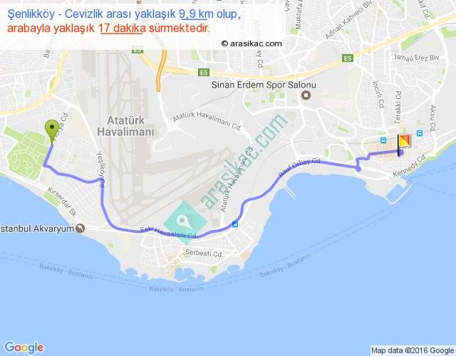 Şenlikköy - Cevizlik arası yaklaşık olarak 90 km/h ile yukarıda belirtilen sürede olup, iki yerin kuş uçuşu uzaklığı (mesafesi) 7'dir. Yolculuk otobüsle 22 dakika sürmektedir.