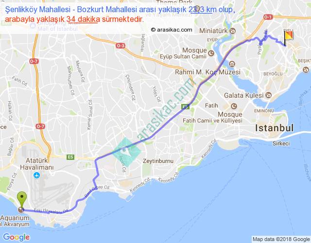 Şenlikköy Mahallesi - Bozkurt Mahallesi arası yaklaşık olarak 90 km/h ile yukarıda belirtilen sürede olup, iki yerin kuş uçuşu uzaklığı (mesafesi) 18'dir. Yolculuk otobüsle 44 dakika sürmektedir.