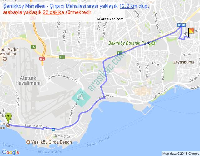 Şenlikköy Mahallesi - Çırpıcı Mahallesi arası yaklaşık olarak 90 km/h ile yukarıda belirtilen sürede olup, iki yerin kuş uçuşu uzaklığı (mesafesi) 9'dir. Yolculuk otobüsle 28 dakika sürmektedir.