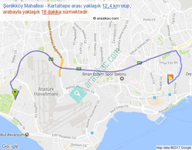 Şenlikköy Mahallesi - Kartaltepe arası yaklaşık olarak 90 km/h ile yukarıda belirtilen sürede olup, iki yerin kuş uçuşu uzaklığı (mesafesi) 7'dir. Yolculuk otobüsle 23 dakika sürmektedir.