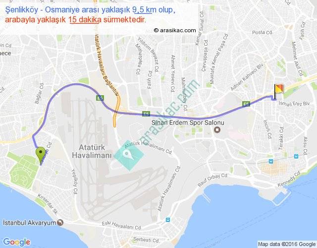 Şenlikköy - Osmaniye arası yaklaşık olarak 90 km/h ile yukarıda belirtilen sürede olup, iki yerin kuş uçuşu uzaklığı (mesafesi) 7'dir. Yolculuk otobüsle 19 dakika sürmektedir.