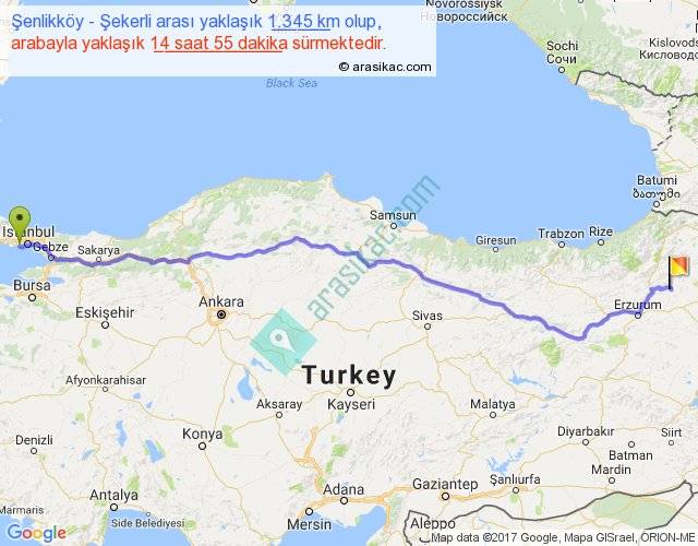 Şenlikköy - Şekerli arası yaklaşık olarak 90 km/h ile yukarıda belirtilen sürede olup, iki yerin kuş uçuşu uzaklığı (mesafesi) 1102'dir. Eğer belirtilen yerler arasında uçak seferi var ise bu süre uçakla 1 saat 41 dakika'ya kadar düşebilir. Yolculuk otobüsle 19 saat 23 dakika sürmektedir.