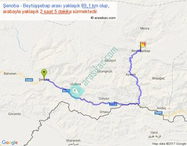 Şenoba - Beytüşşebap arası yaklaşık olarak 90 km/h ile yukarıda belirtilen sürede olup, iki yerin kuş uçuşu uzaklığı (mesafesi) 42'dir. Yolculuk otobüsle 2 saat 42 dakika sürmektedir.