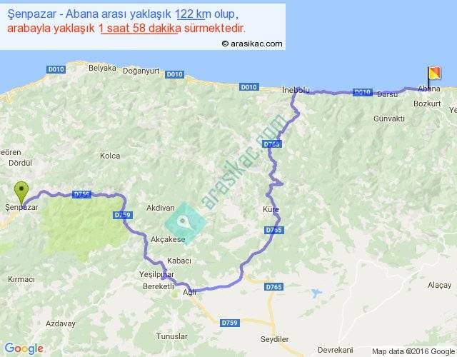 Şenpazar - Abana arası yaklaşık olarak 90 km/h ile yukarıda belirtilen sürede olup, iki yerin kuş uçuşu uzaklığı (mesafesi) 67'dir. Yolculuk otobüsle 2 saat 33 dakika sürmektedir.