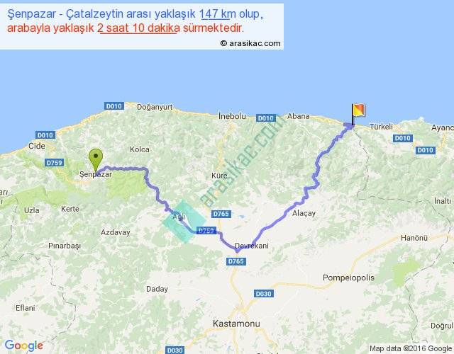 Şenpazar - Çatalzeytin arası yaklaşık olarak 90 km/h ile yukarıda belirtilen sürede olup, iki yerin kuş uçuşu uzaklığı (mesafesi) 83'dir. Yolculuk otobüsle 2 saat 49 dakika sürmektedir.