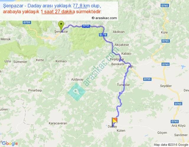Şenpazar - Daday arası yaklaşık olarak 90 km/h ile yukarıda belirtilen sürede olup, iki yerin kuş uçuşu uzaklığı (mesafesi) 42'dir. Yolculuk otobüsle 1 saat 53 dakika sürmektedir.