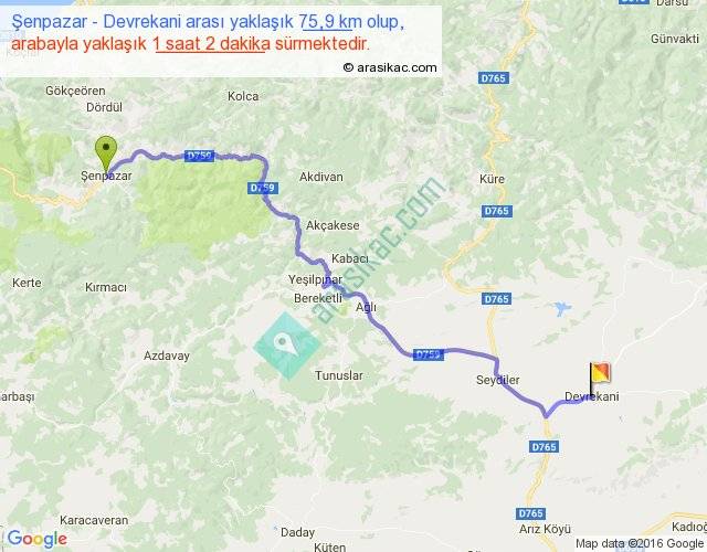 Şenpazar - Devrekani arası yaklaşık olarak 90 km/h ile yukarıda belirtilen sürede olup, iki yerin kuş uçuşu uzaklığı (mesafesi) 55'dir. Yolculuk otobüsle 1 saat 20 dakika sürmektedir.