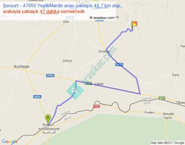 Şenyurt - 47650 Yeşilli Mardin arası yaklaşık olarak 90 km/h ile yukarıda belirtilen sürede olup, iki yerin kuş uçuşu uzaklığı (mesafesi) 26'dir. Yolculuk otobüsle 1 saat 1 dakika sürmektedir.