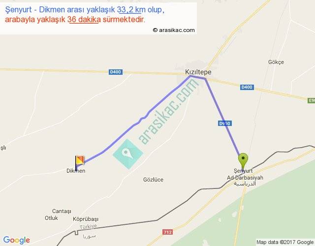 Şenyurt - Dikmen arası yaklaşık olarak 90 km/h ile yukarıda belirtilen sürede olup, iki yerin kuş uçuşu uzaklığı (mesafesi) 21'dir. Yolculuk otobüsle 46 dakika sürmektedir.