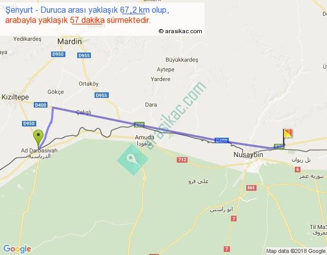 Şenyurt - Duruca arası yaklaşık olarak 90 km/h ile yukarıda belirtilen sürede olup, iki yerin kuş uçuşu uzaklığı (mesafesi) 58'dir. Yolculuk otobüsle 1 saat 14 dakika sürmektedir.