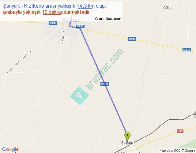 Şenyurt - Kızıltepe arası yaklaşık olarak 90 km/h ile yukarıda belirtilen sürede olup, iki yerin kuş uçuşu uzaklığı (mesafesi) 13'dir. Yolculuk otobüsle 24 dakika sürmektedir.