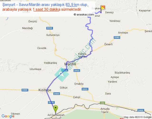 Şenyurt - Savur Mardin arası yaklaşık olarak 90 km/h ile yukarıda belirtilen sürede olup, iki yerin kuş uçuşu uzaklığı (mesafesi) 56'dir. Yolculuk otobüsle 1 saat 57 dakika sürmektedir.