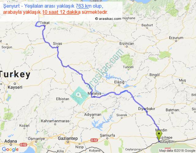 Şenyurt - Yeşilalan arası yaklaşık olarak 90 km/h ile yukarıda belirtilen sürede olup, iki yerin kuş uçuşu uzaklığı (mesafesi) 524'dir. Eğer belirtilen yerler arasında uçak seferi var ise bu süre uçakla 48 dakika'ya kadar düşebilir. Yolculuk otobüsle 13 saat 15 dakika sürmektedir.