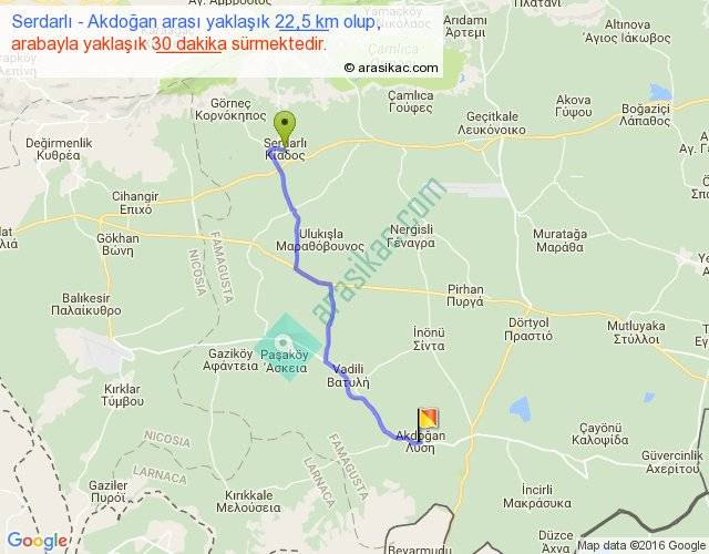 Serdarlı - Akdoğan arası yaklaşık olarak 90 km/h ile yukarıda belirtilen sürede olup, iki yerin kuş uçuşu uzaklığı (mesafesi) 18'dir. Yolculuk otobüsle 39 dakika sürmektedir.