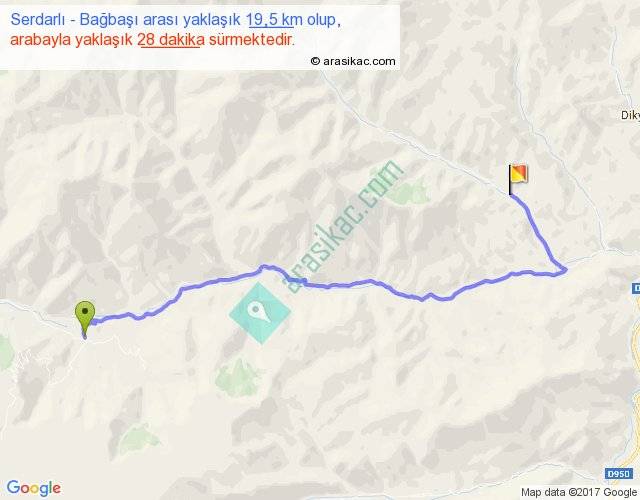 Serdarlı - Bağbaşı arası yaklaşık olarak 90 km/h ile yukarıda belirtilen sürede olup, iki yerin kuş uçuşu uzaklığı (mesafesi) 13'dir. Yolculuk otobüsle 36 dakika sürmektedir.