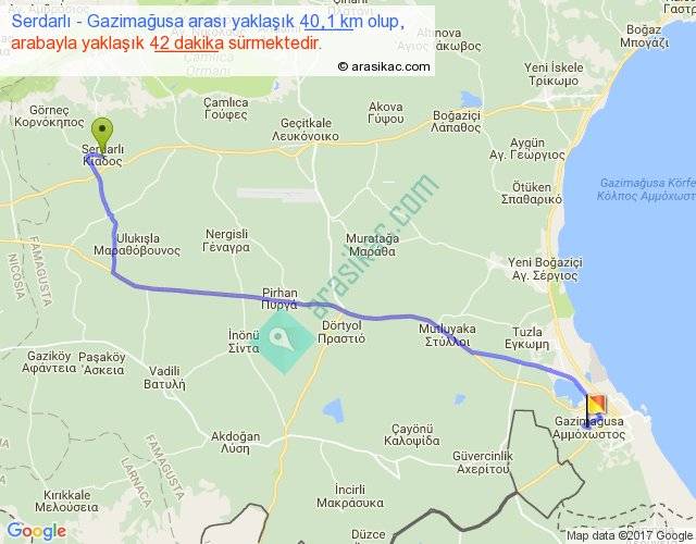 Serdarlı - Gazimağusa arası yaklaşık olarak 90 km/h ile yukarıda belirtilen sürede olup, iki yerin kuş uçuşu uzaklığı (mesafesi) 32'dir. Yolculuk otobüsle 54 dakika sürmektedir.