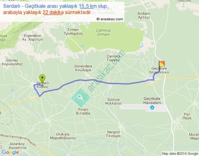 Serdarlı - Geçitkale arası yaklaşık olarak 90 km/h ile yukarıda belirtilen sürede olup, iki yerin kuş uçuşu uzaklığı (mesafesi) 12'dir. Yolculuk otobüsle 28 dakika sürmektedir.